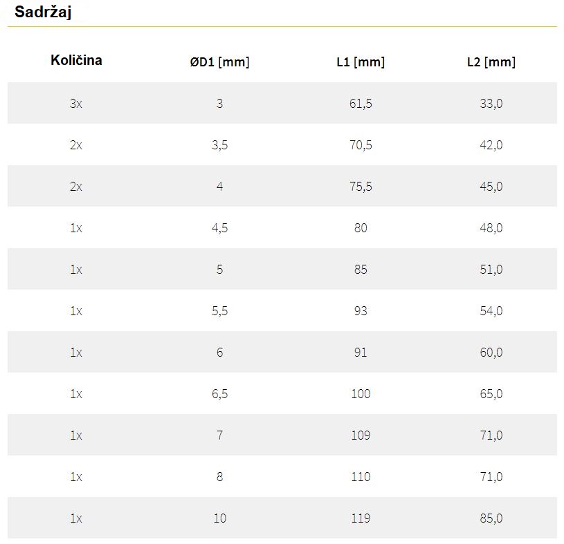 Burgija za drvo provjerene industreijske kvalitete. Ovaj set burgija sadrži sve uobičajene veličine u rasponu 3-10 mm, neke veličine u nekoliko komada.